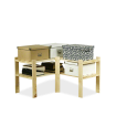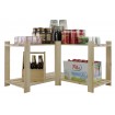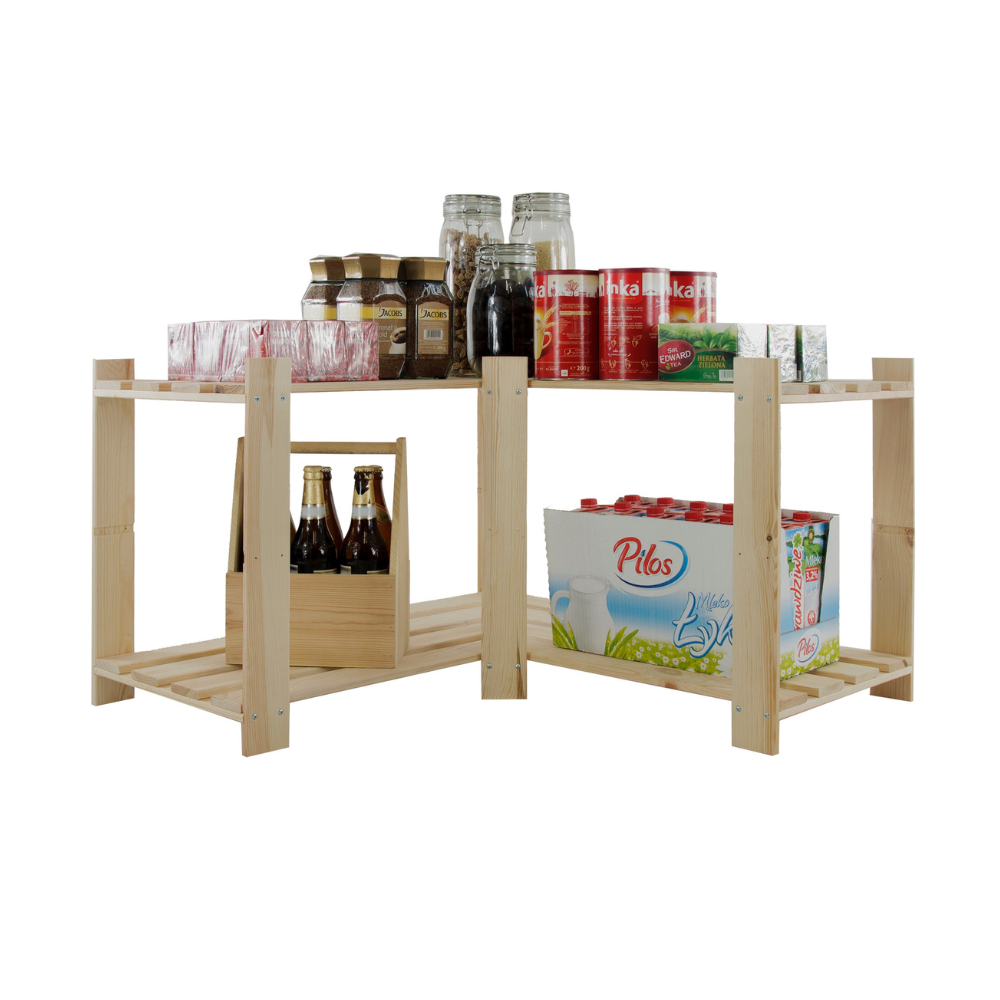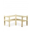 Narożny regał z dwiema półkami, wykonany z surowego drewna.