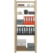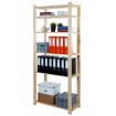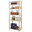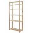 Prosty regał z sześcioma półkami, wykonany z surowego drewna.
