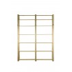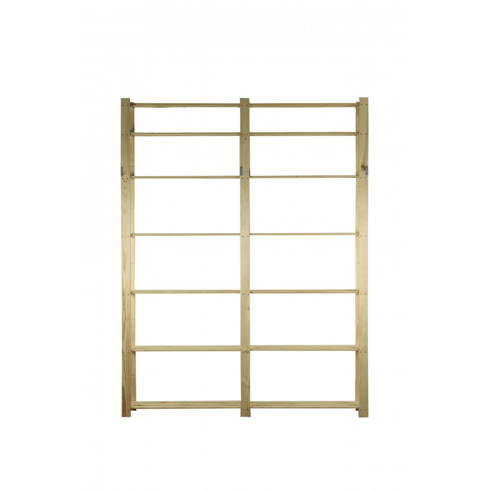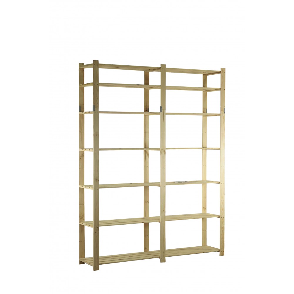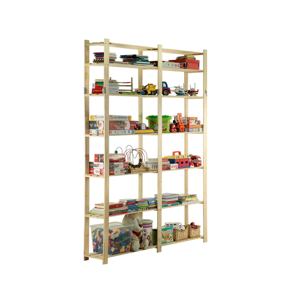 Prosty regał z siedmioma półkami, wykonany z surowego drewna.