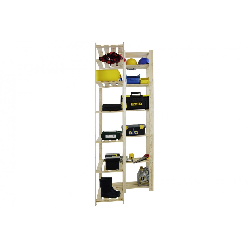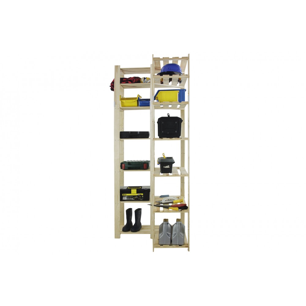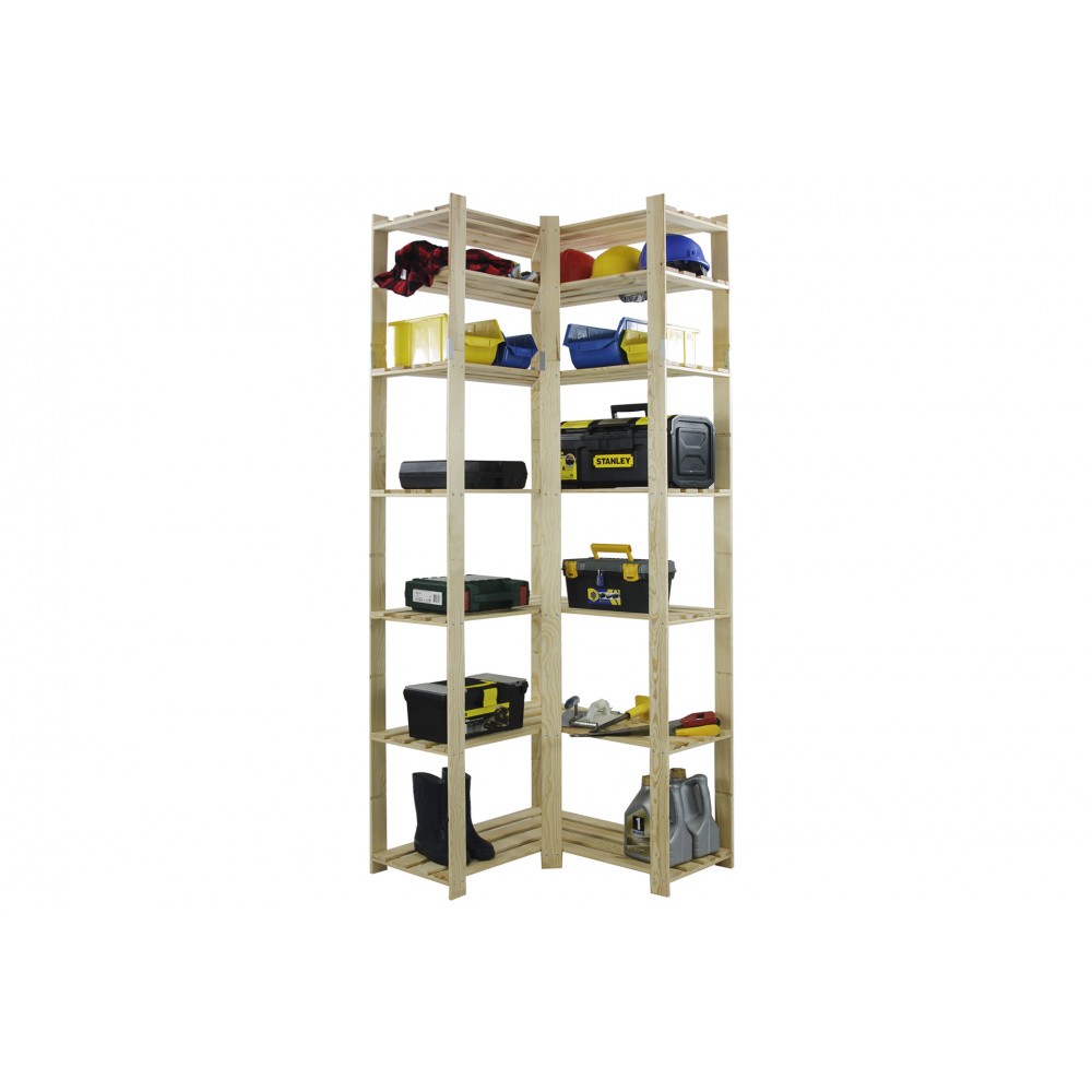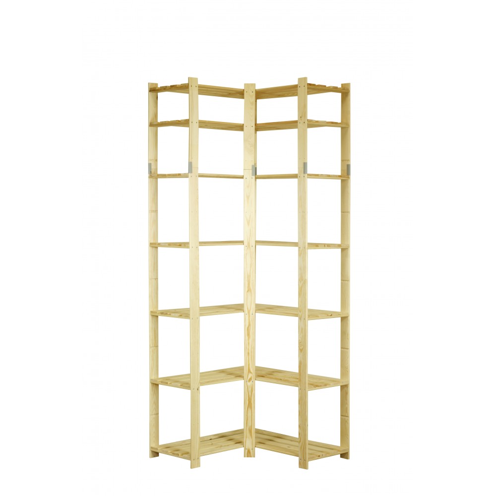 Narożny regał z siedmioma półkami, wykonany z surowego drewna.