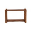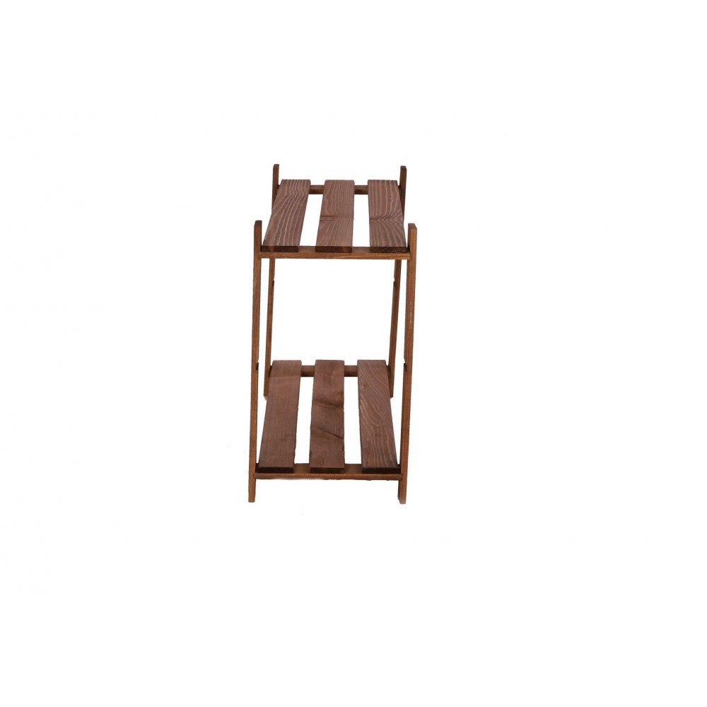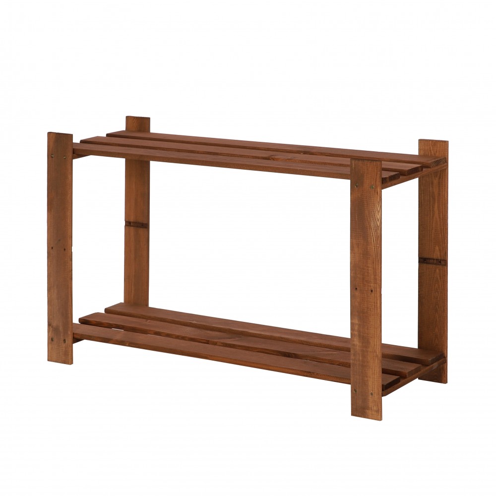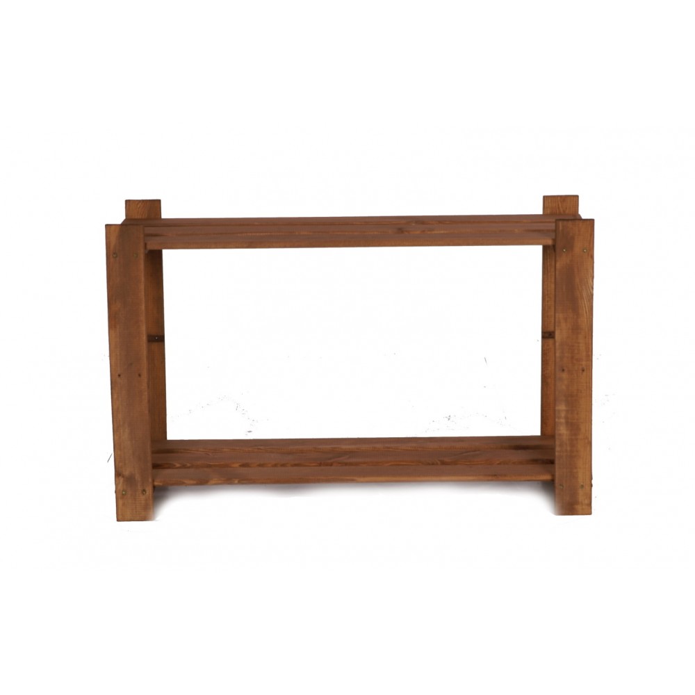 Prosty regał z dwiema półkami, wykonany z drewna.
