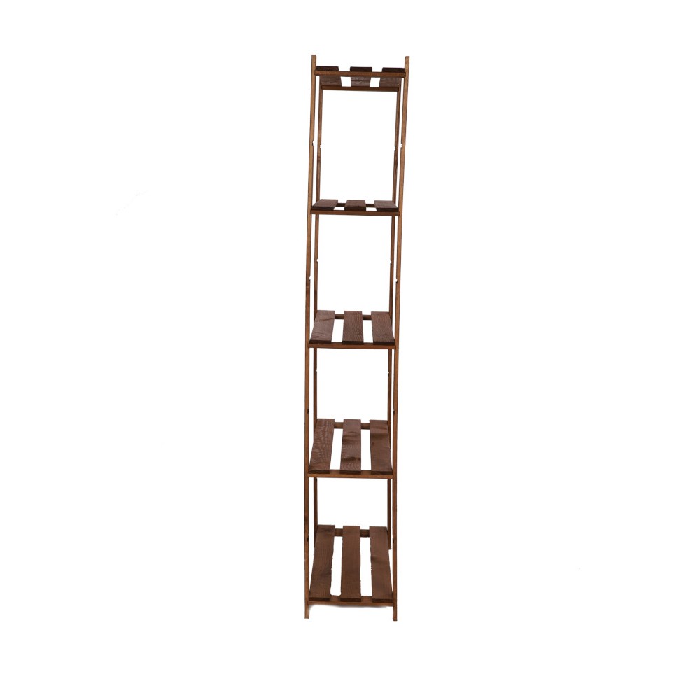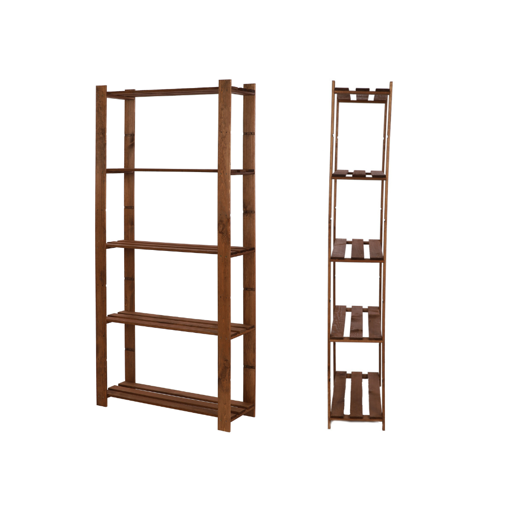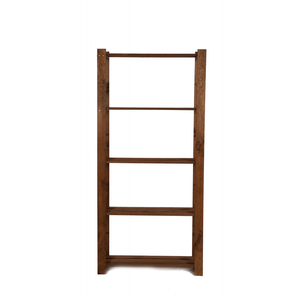 Prosty regał z 5-cioma półkami, wykonany z drewna.
