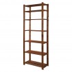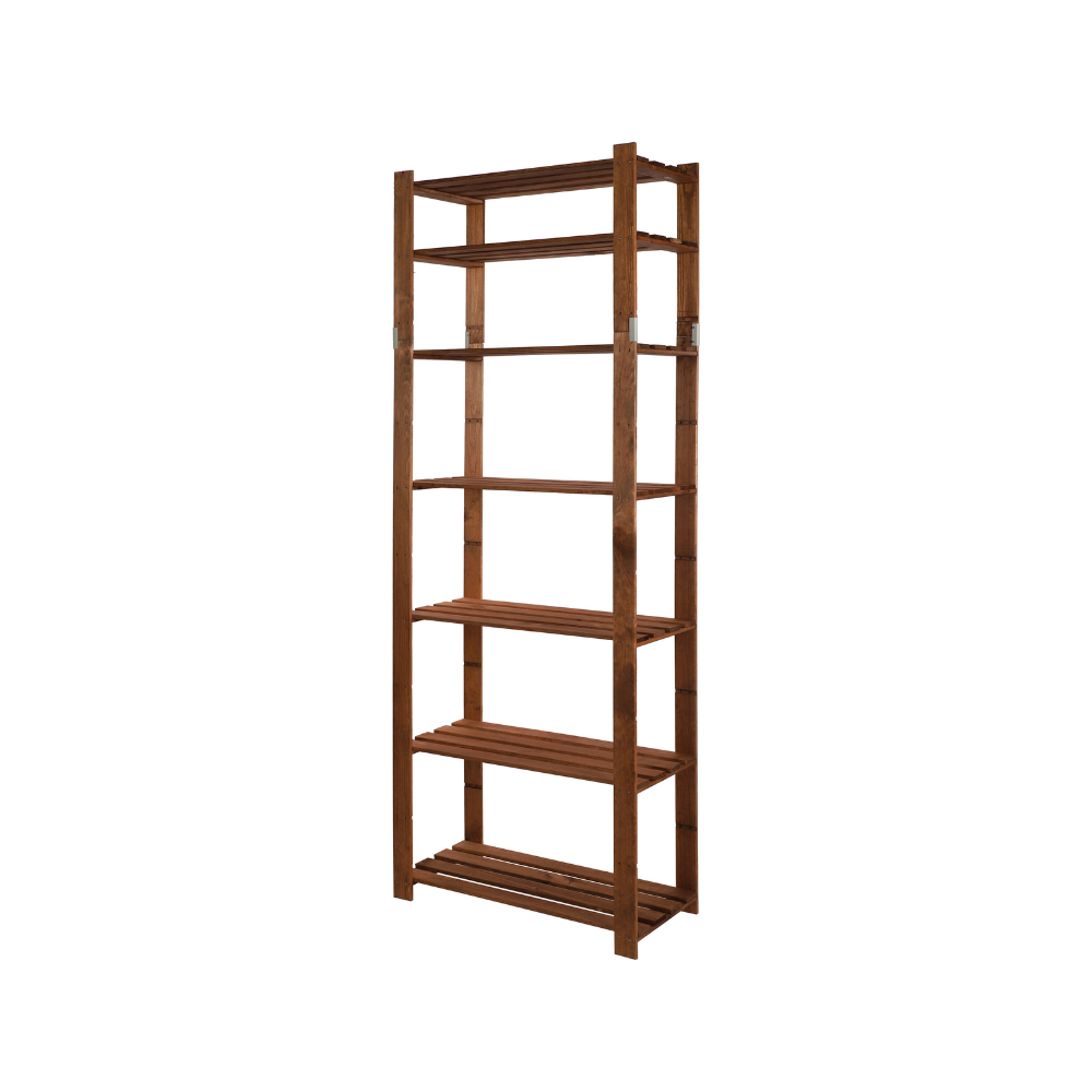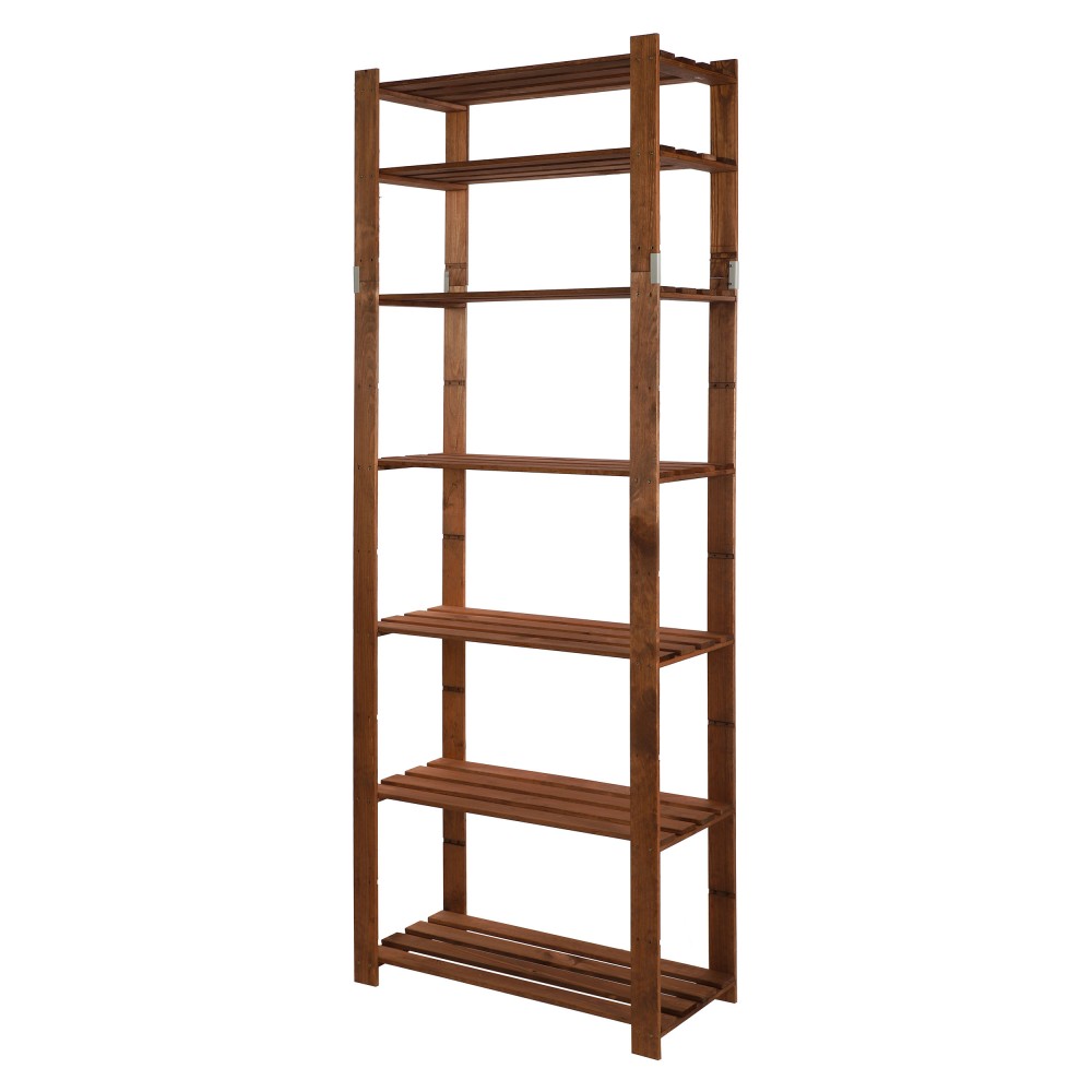 Prosty regał z siedmioma półkami, wykonany z drewna.