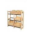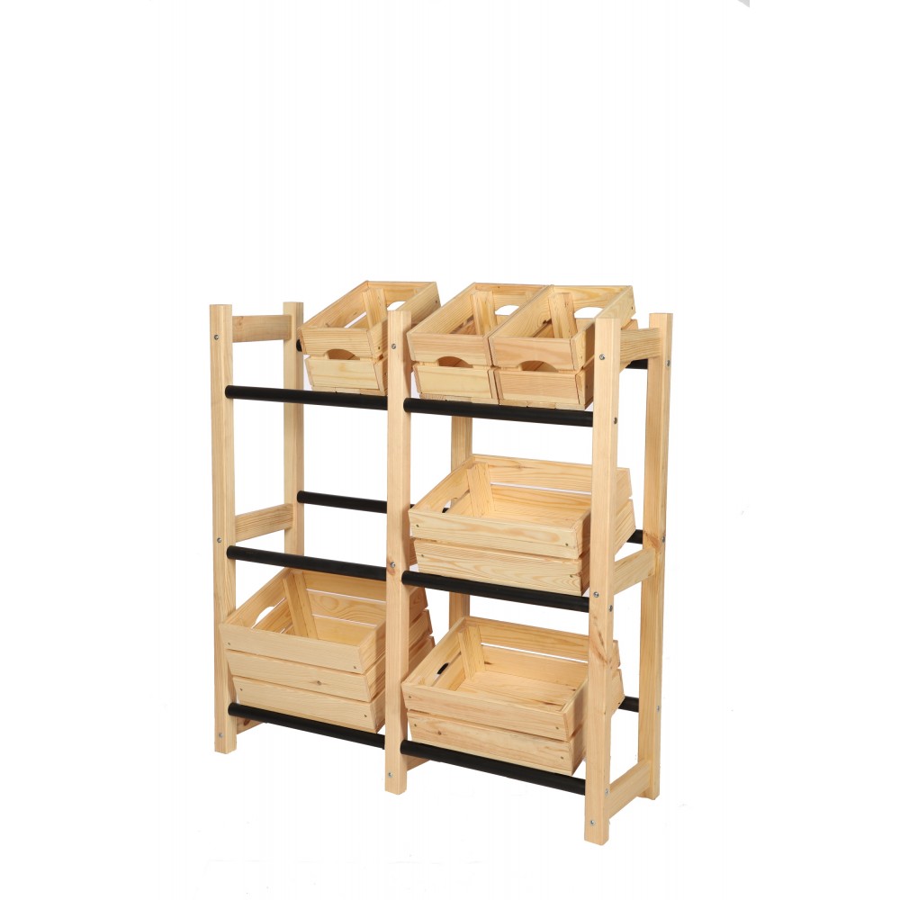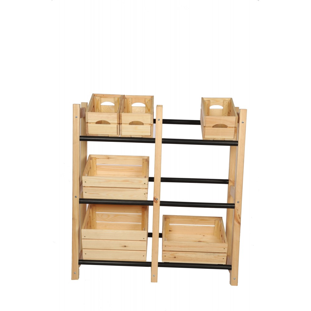 Regał na skrzynki transportowe, plastikowe i drewniane.