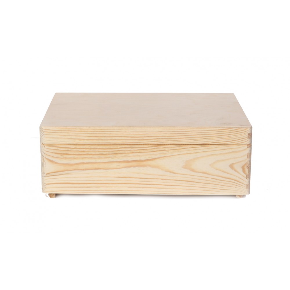 Skrzyneczka drewniana z pełnymi bokami i dnem z płyty HDF. Zaopatrzona w wieko.