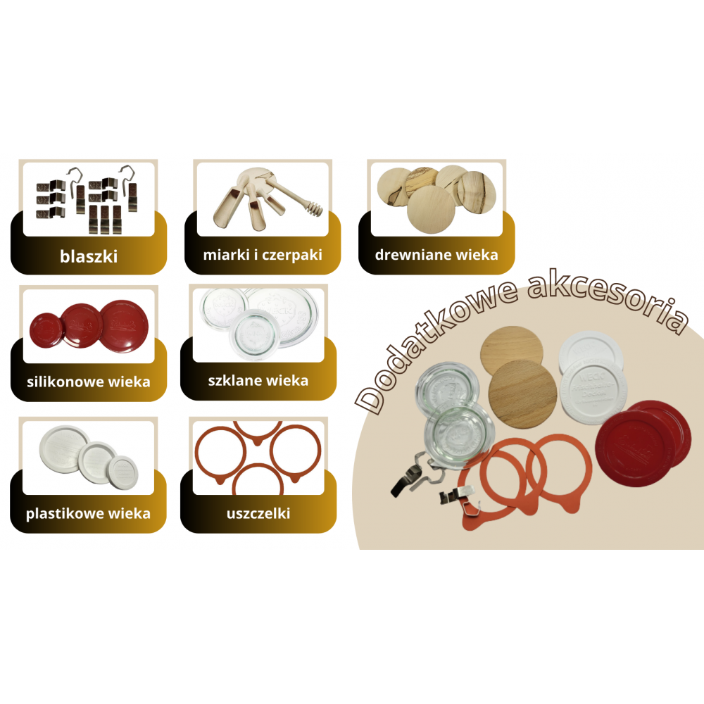 – Weki na zimę - wieczka szklane z gumką oraz metalowymi klipsami.