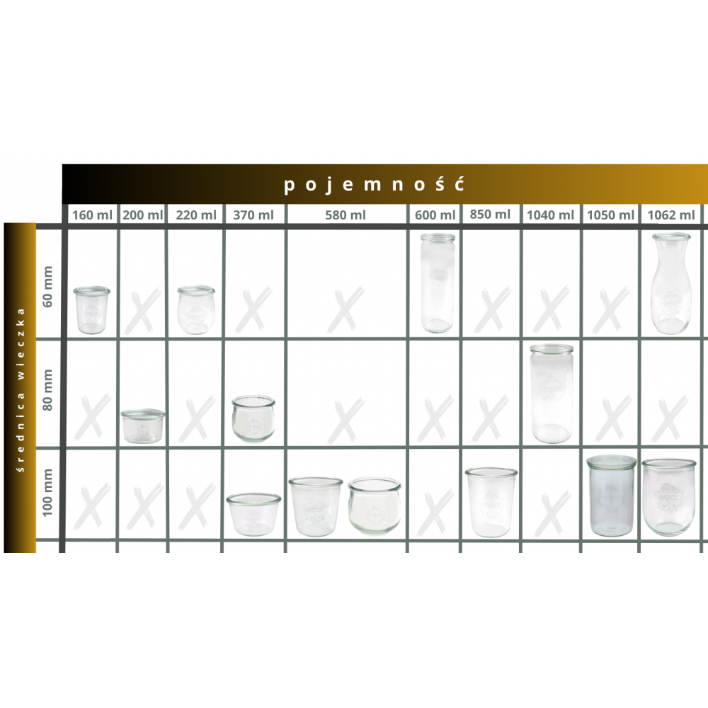 - słoiki weck w zestawach 6 i 12 sztuk, w przedziale objętości od 160 - 1062 ml;
