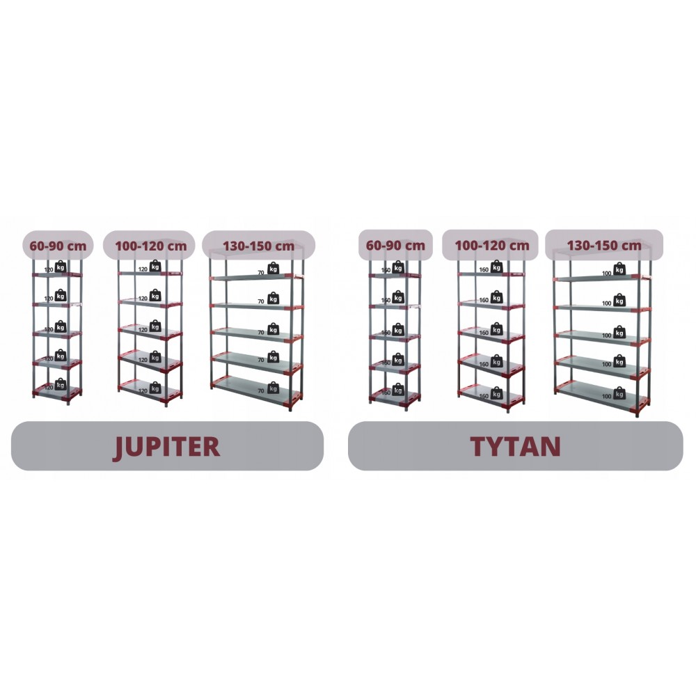 W przypadku regałów Jupiter, maksymalne obciążenie na blat wynosi w zależności od modelu 70 lub 120 kg.