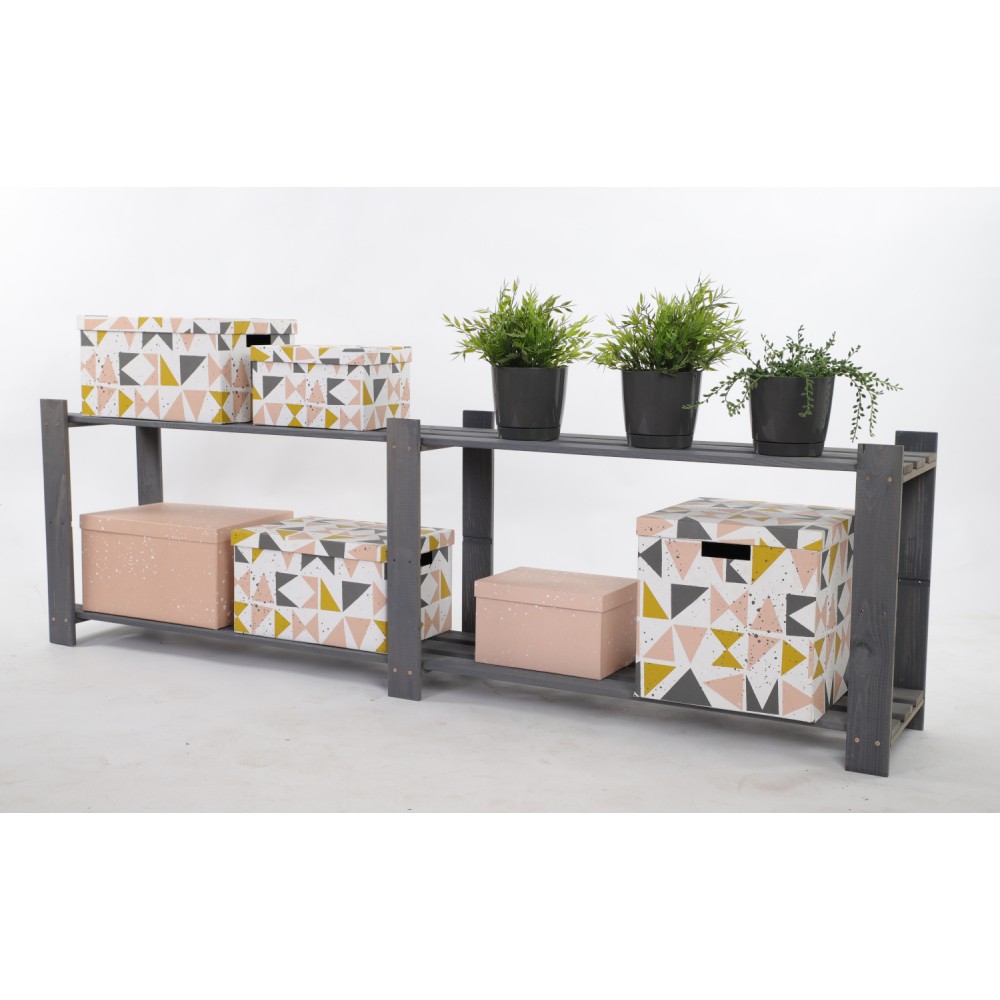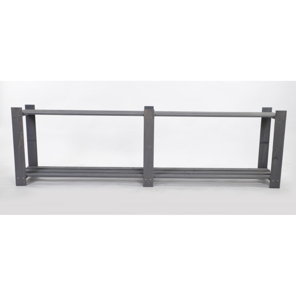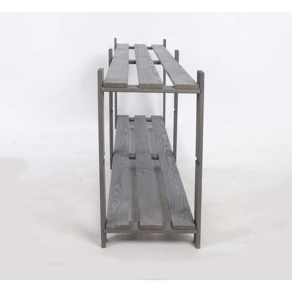 Prosty regał z dwiema półkami, wykonany z drewna.