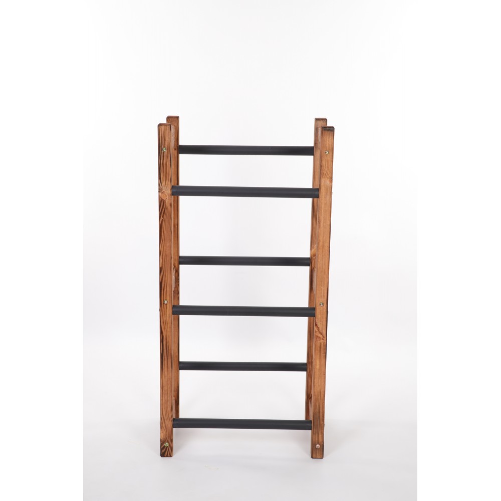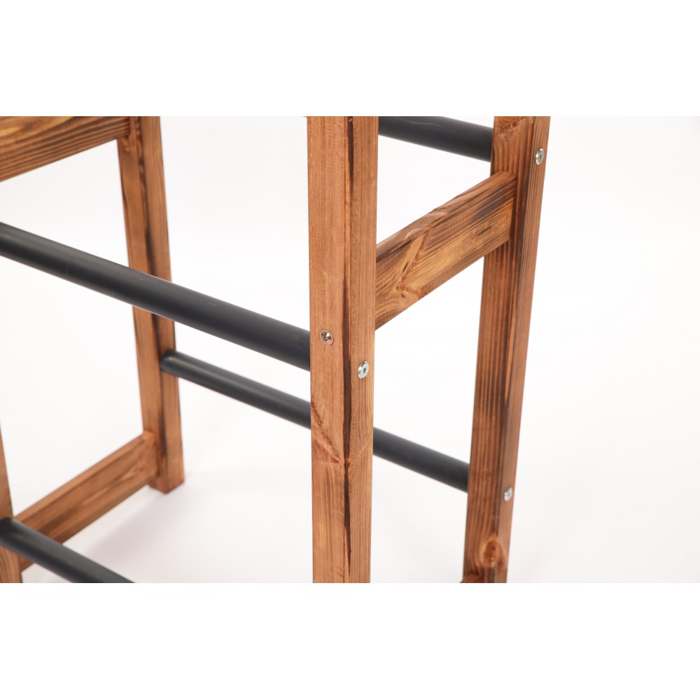 Brązowe sosnowe boki świetnie korelują z czarnymi, plastikowymi drążkami.