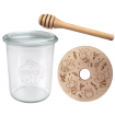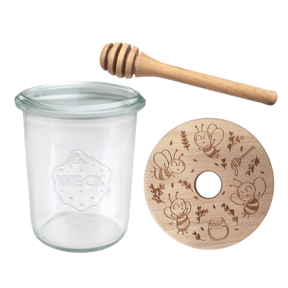 - Zestaw zawiera: słoik, drewniane wieko z uszczelką oraz nabierak do miodu.