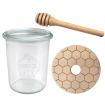 - Zestaw zawiera: słoik, drewniane wieko z uszczelką oraz nabierak do miodu.