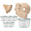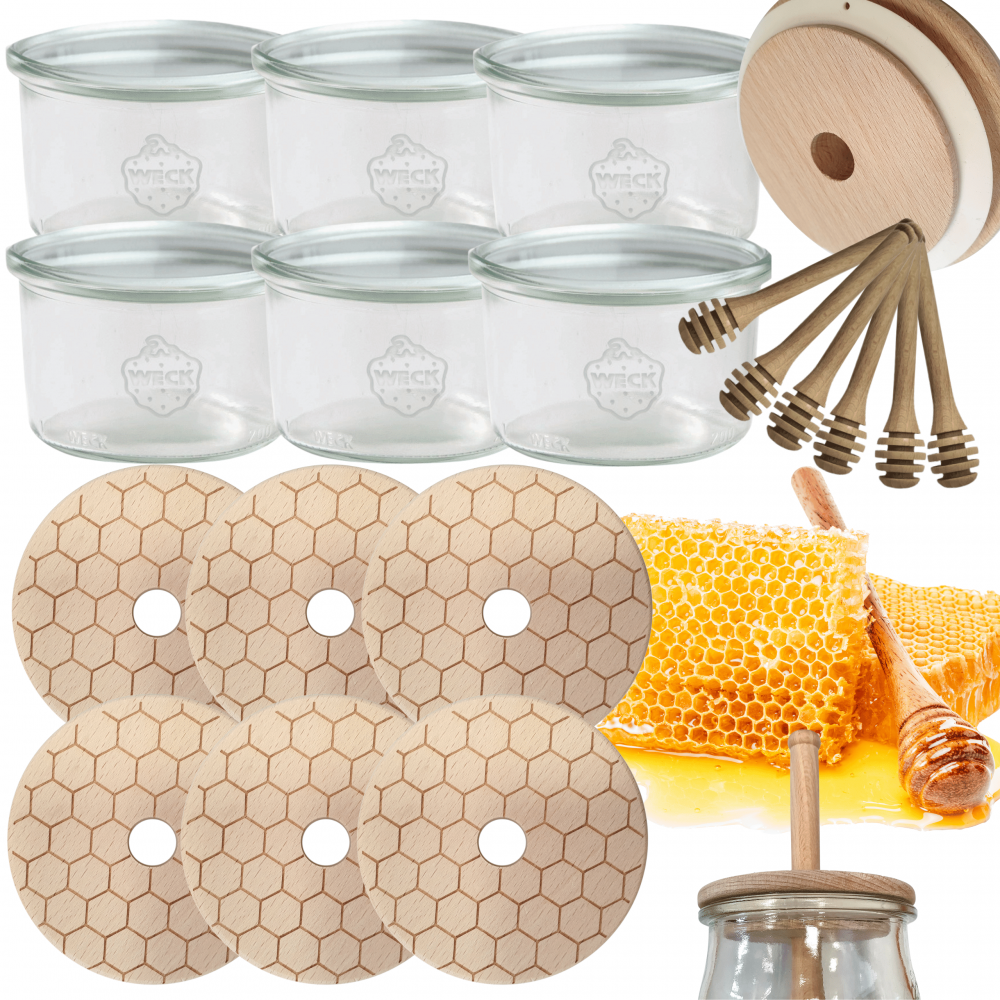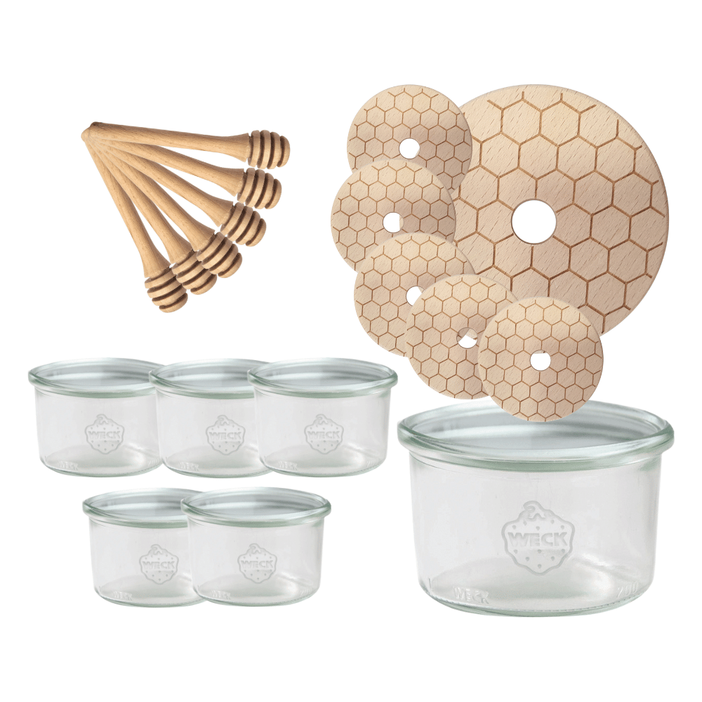 - Zestaw zawiera: słoik (6szt), drewniane wieko z uszczelką (6szt) oraz nabierak do miodu (6szt).