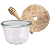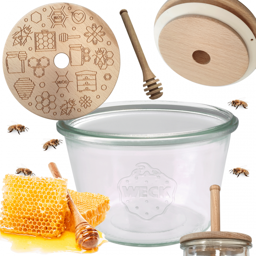 - Zestaw zawiera: słoik, drewniane wieko z uszczelką oraz nabierak do miodu.
