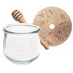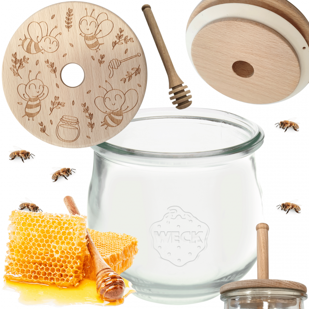 - Zestaw zawiera: słoik, drewniane wieko z uszczelką oraz nabierak do miodu.
