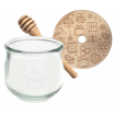 - Zestaw zawiera: słoik, drewniane wieko z uszczelką oraz nabierak do miodu.