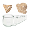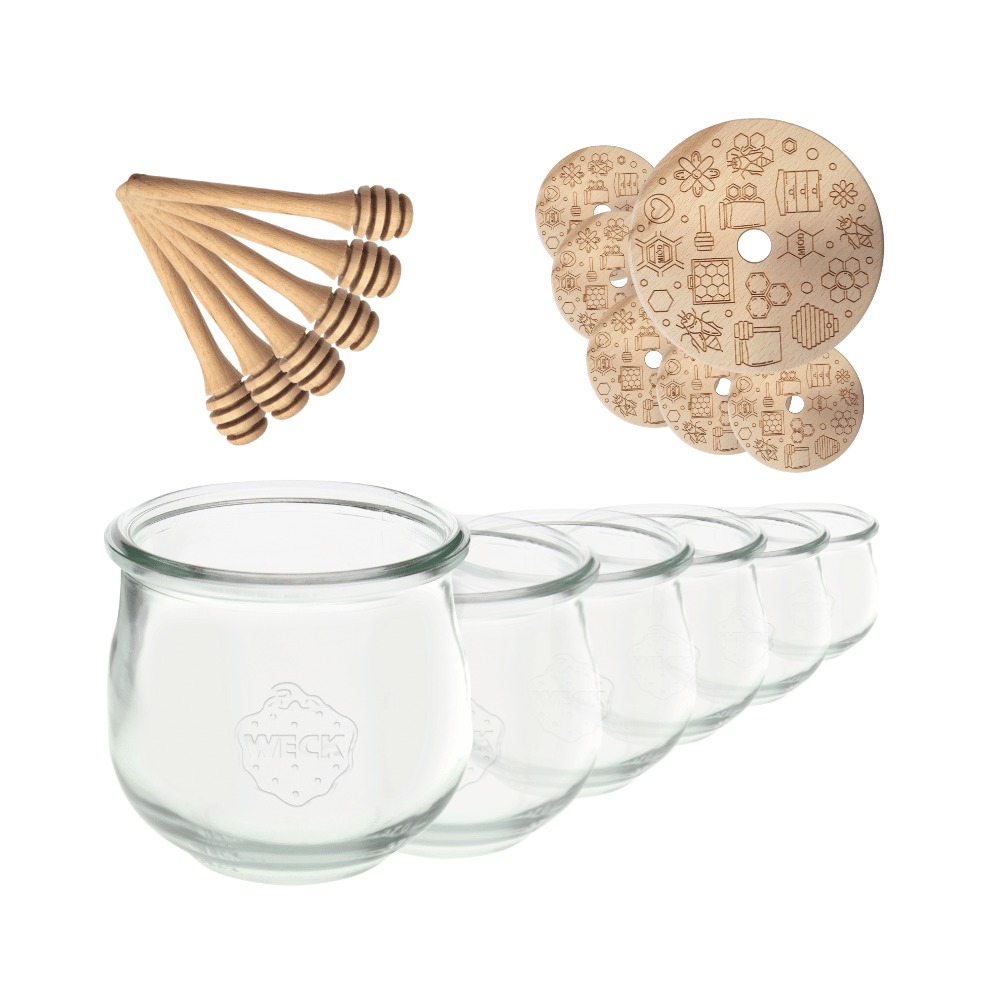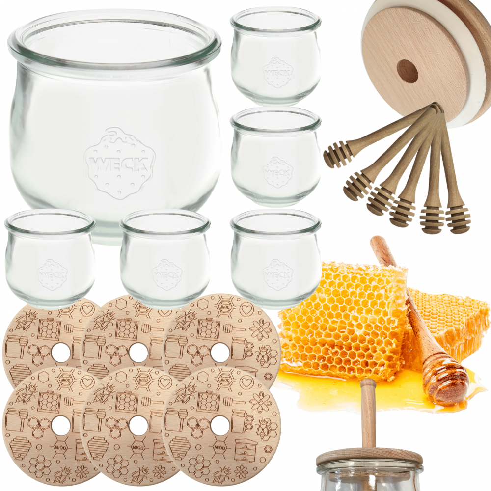 - Zestaw zawiera: słoik (6szt), drewniane wieko z uszczelką (6szt) oraz nabierak do miodu (6szt).