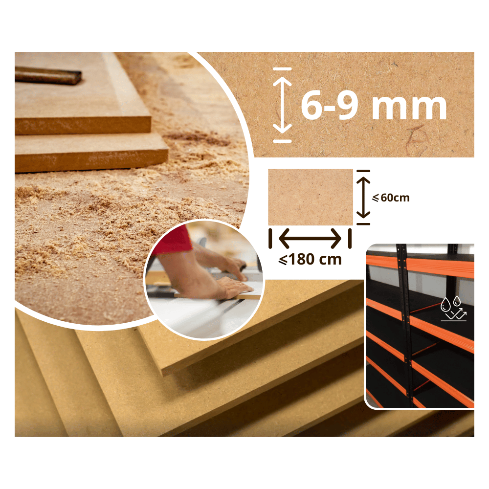 W naszych regałach zastosowaliśmy odporną płytę MDF o grubości nawet do 9mm. Płyty są przez nas docinane również na niestandardowe wymiary - które również możesz zakupić na naszych aukcjach. Jako nieliczni na rynku oferujemy maksymalną ilość kombinacji regałów.