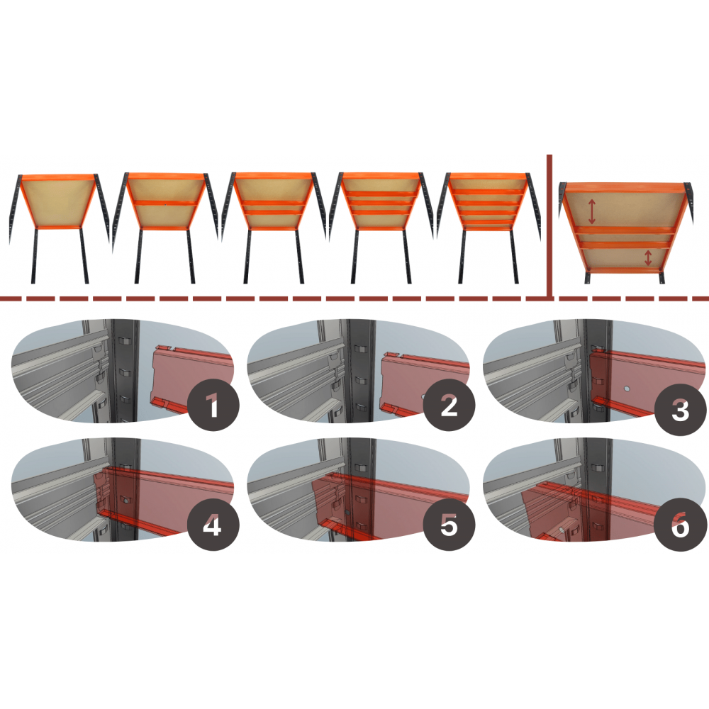 Pojedyncze regały połączysz ze sobą w szeregu za pomocą stalowych łączników. Łączy się nimi dwie nogi na dowolnej wysokości. Aby połączyć dwa regały ze sobą użyj kompletu 4 łączników.