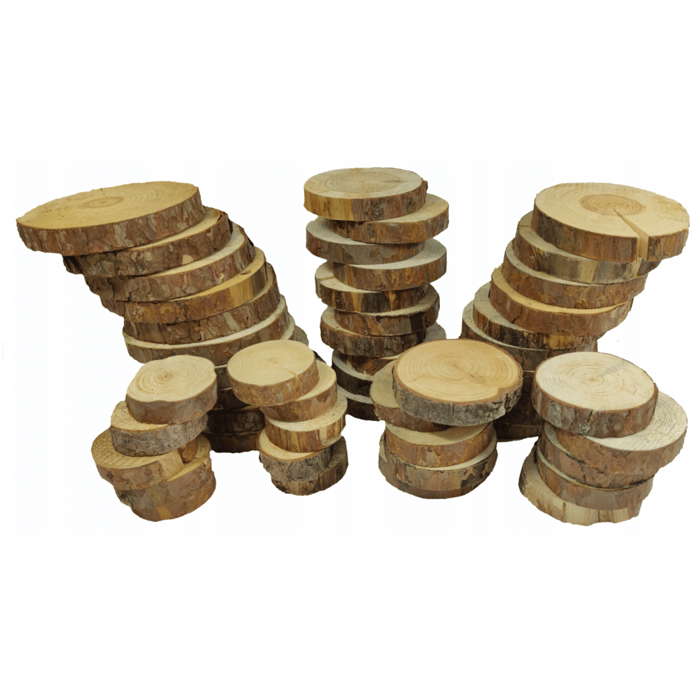 ➡️ Każdy zestaw zawiera 50 sztuk plastrów o średnicach od 10 do 25 cm, wykonanych z wysokiej jakości drewna iglastego.