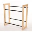 Drewniany stojak ekspozycyjny na skrzynki z metalowymi drążkami. Od polskiego producenta. Egzemplarz z bogatej kolekcji stojaków na skrzynki.