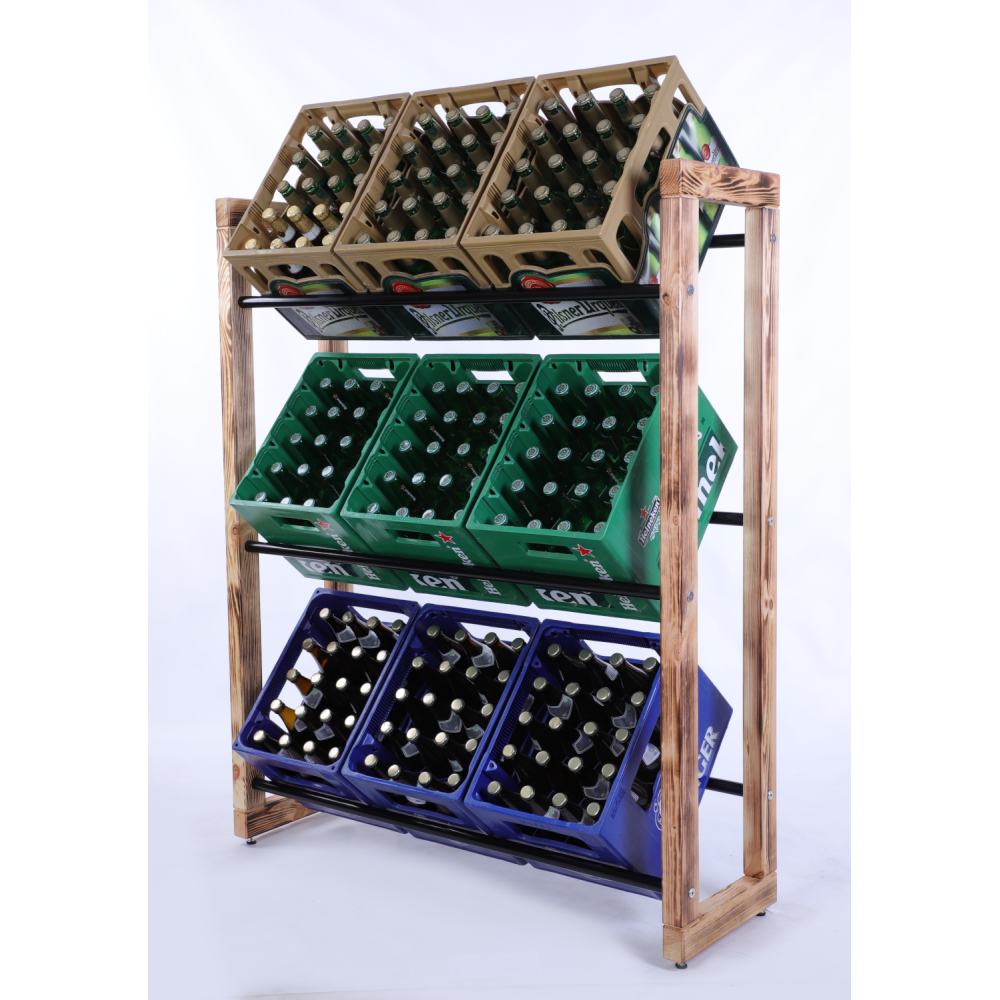 Drewniany stojak ekspozycyjny na skrzynki z metalowymi drążkami. Od polskiego producenta. Egzemplarz z bogatej kolekcji stojaków na skrzynki.