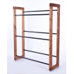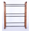 Drewniany stojak ekspozycyjny na skrzynki z metalowymi drążkami. Od polskiego producenta. Egzemplarz z bogatej kolekcji stojaków na skrzynki.