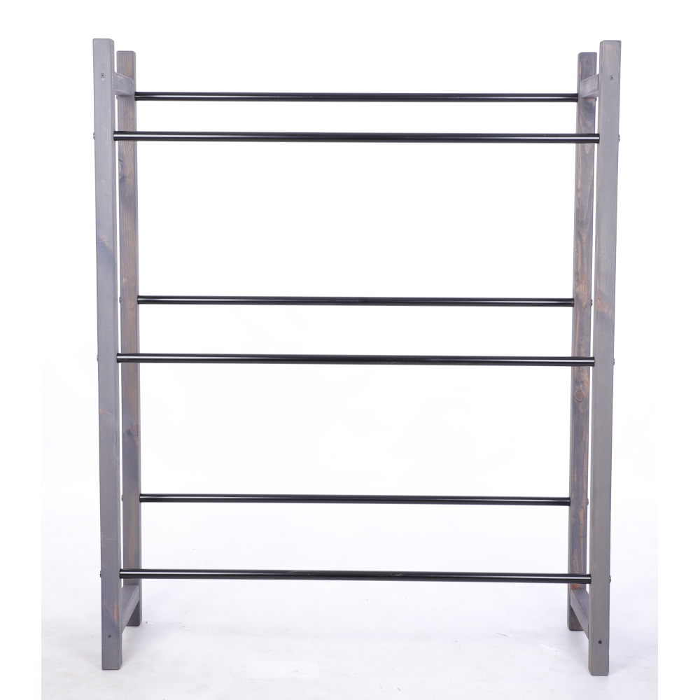 Regał wykonany jest z naturalnego drewna sosnowego, które w połączeniu z czarnymi metalowymi drążkami nadaje elegancki i nowoczesny wygląd.