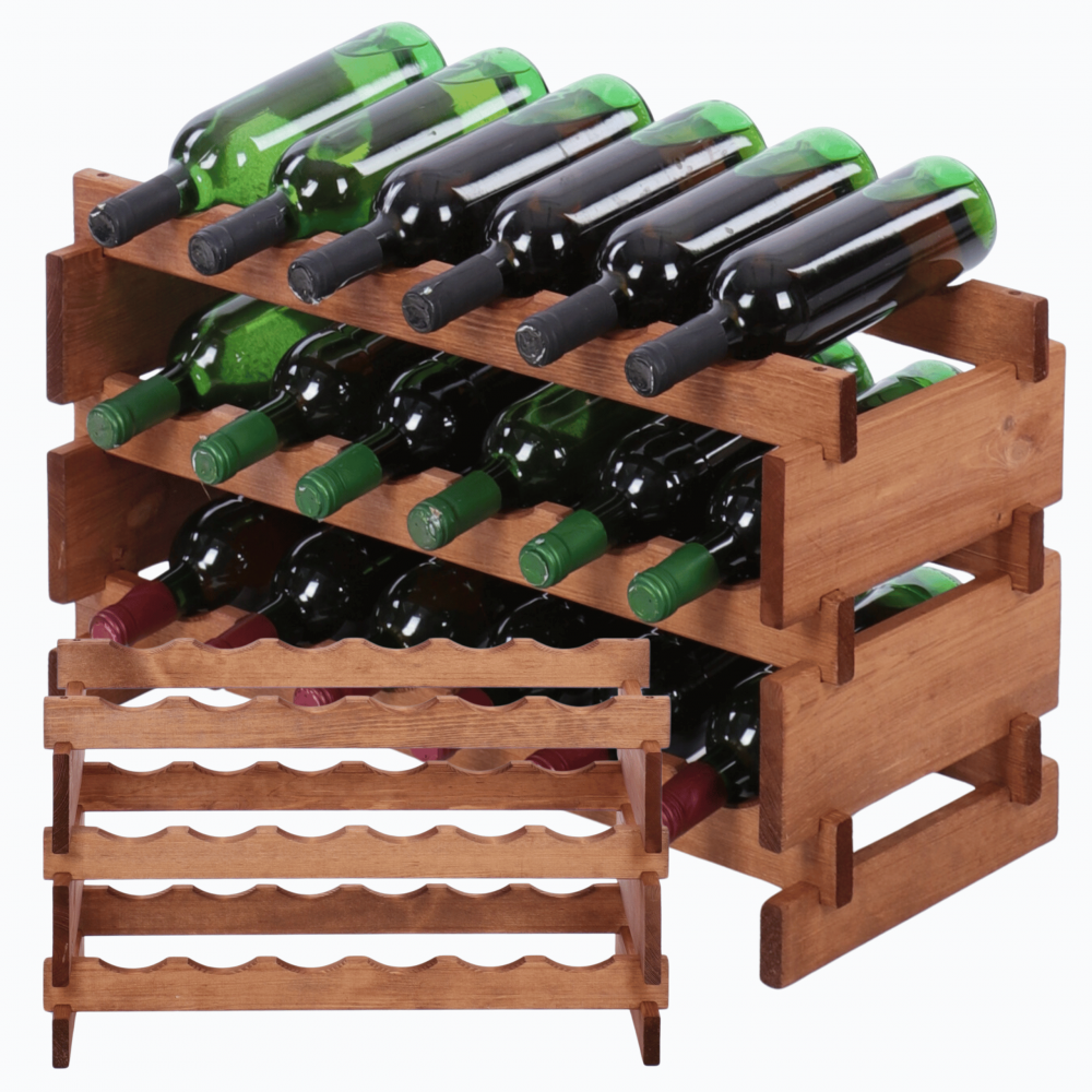 Modułowy drewniany stojak na butelki – polska produkcja, naturalne drewno, łatwy montaż bez narzędzi! Egzemplarz z najbogatszej kolekcji regałów tego typu na rynku.
