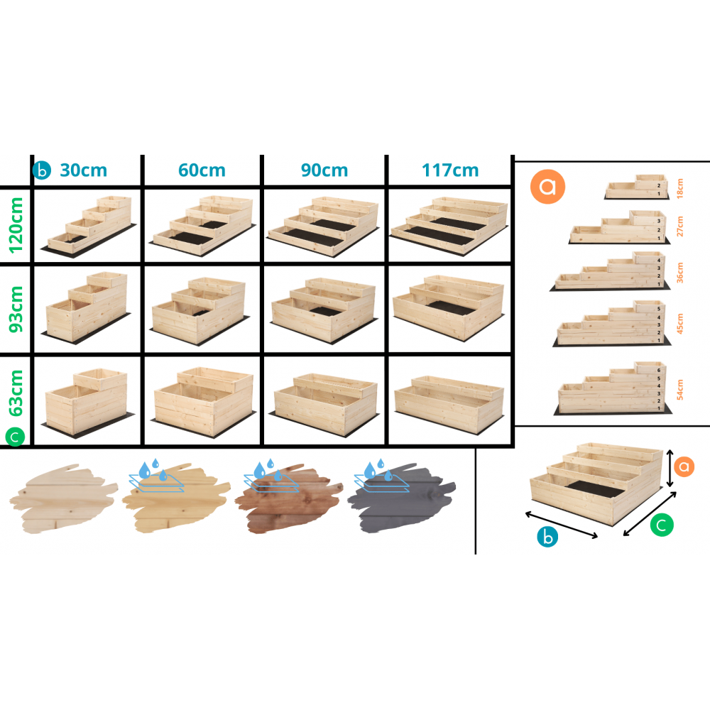 Jako nieliczni na rynku zapewniamy najbogatszy wybór kombinacji skrzyni na warzywa. Skrzynie zakupisz aż w pięciu wysokościach - od 18 do 54cm. Różnorodność szerokości i głębokości pozwoli Ci na zakup skrzyni idealnie dostosowanej wymiarami do miejsca jakim dysponujesz. Grządki o wykończeniu naturalnym możesz sam pomalować na wybrany kolor. U nas zakupisz również grządki zaimpregnowane na kolor przeźroczysty, brązowy i szary. Zachęcamy do przejrzenia całej naszej oferty.