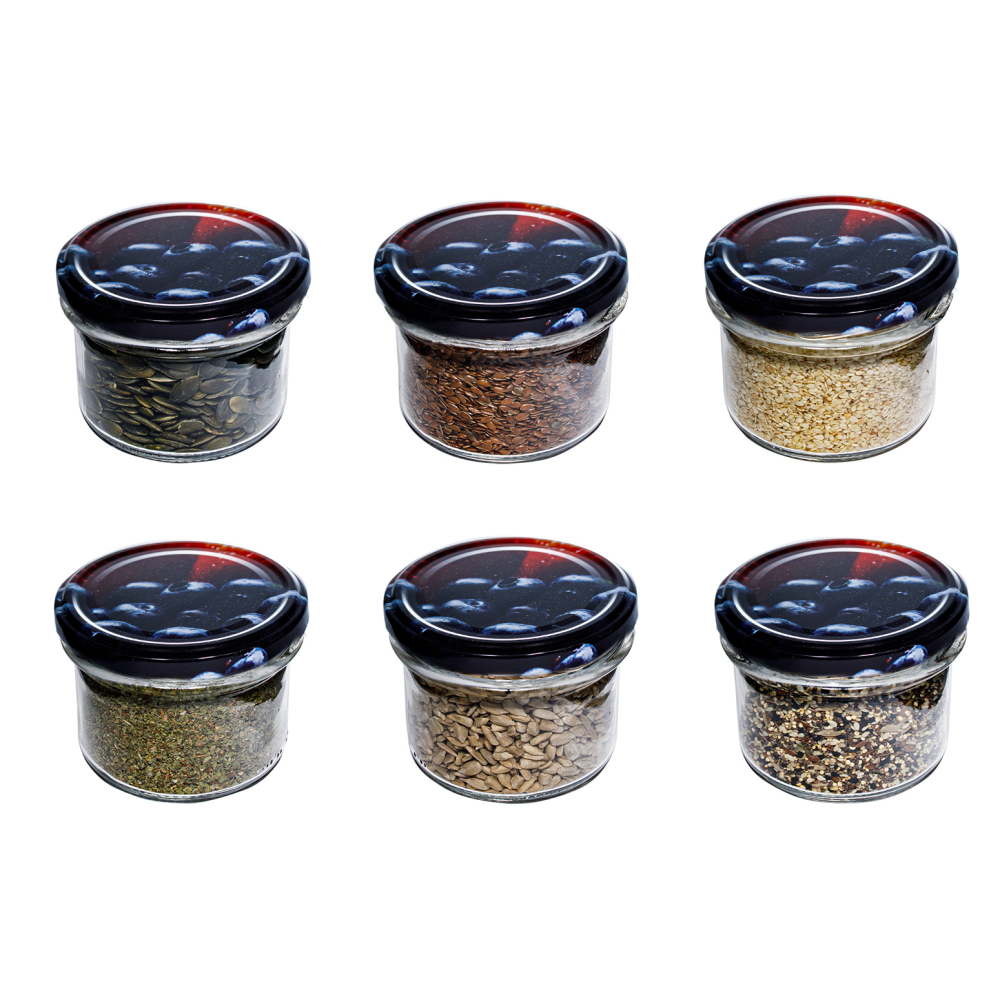 Zestaw sześciu słoiczków wielokrotnego użytku z atestem do kontaktu z żywnością.
