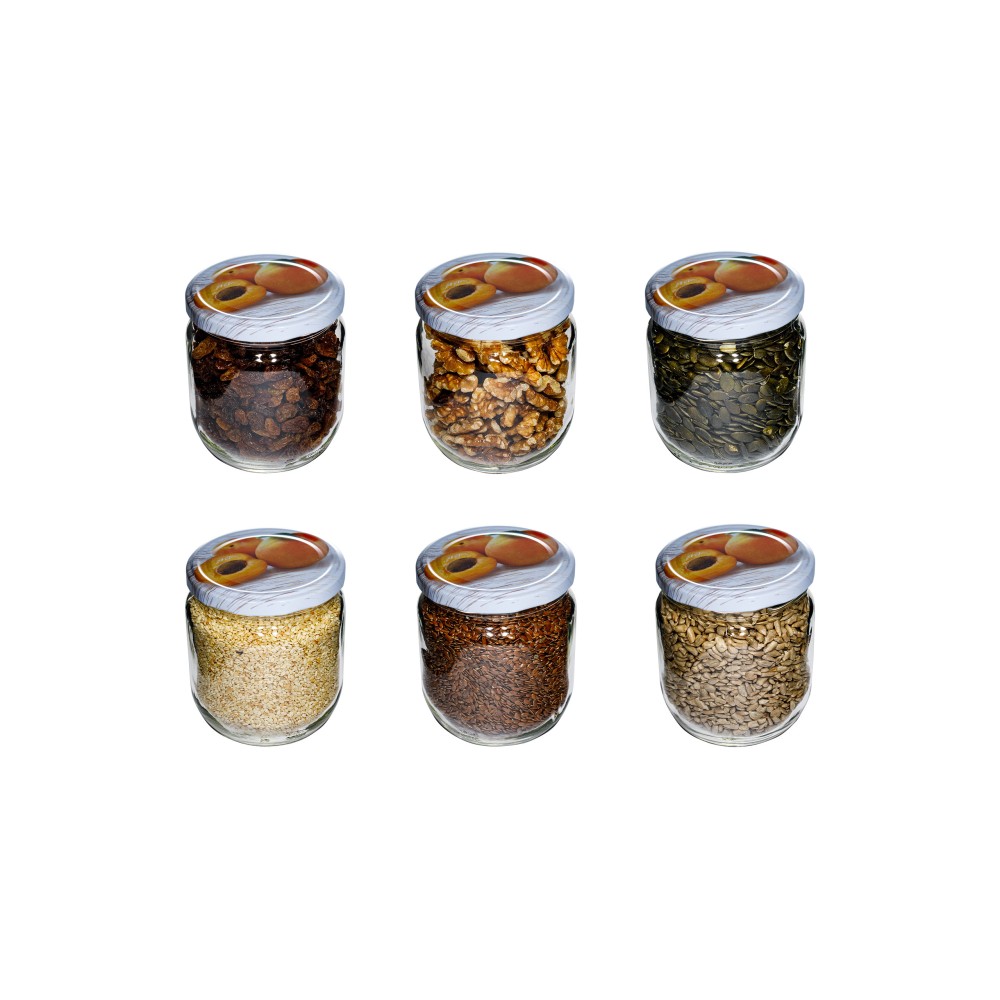 Słoik 425 ml zwykły · Pokrywka (⌀82) z nadrukiem “morelowym” · Komplet 6 sztuk