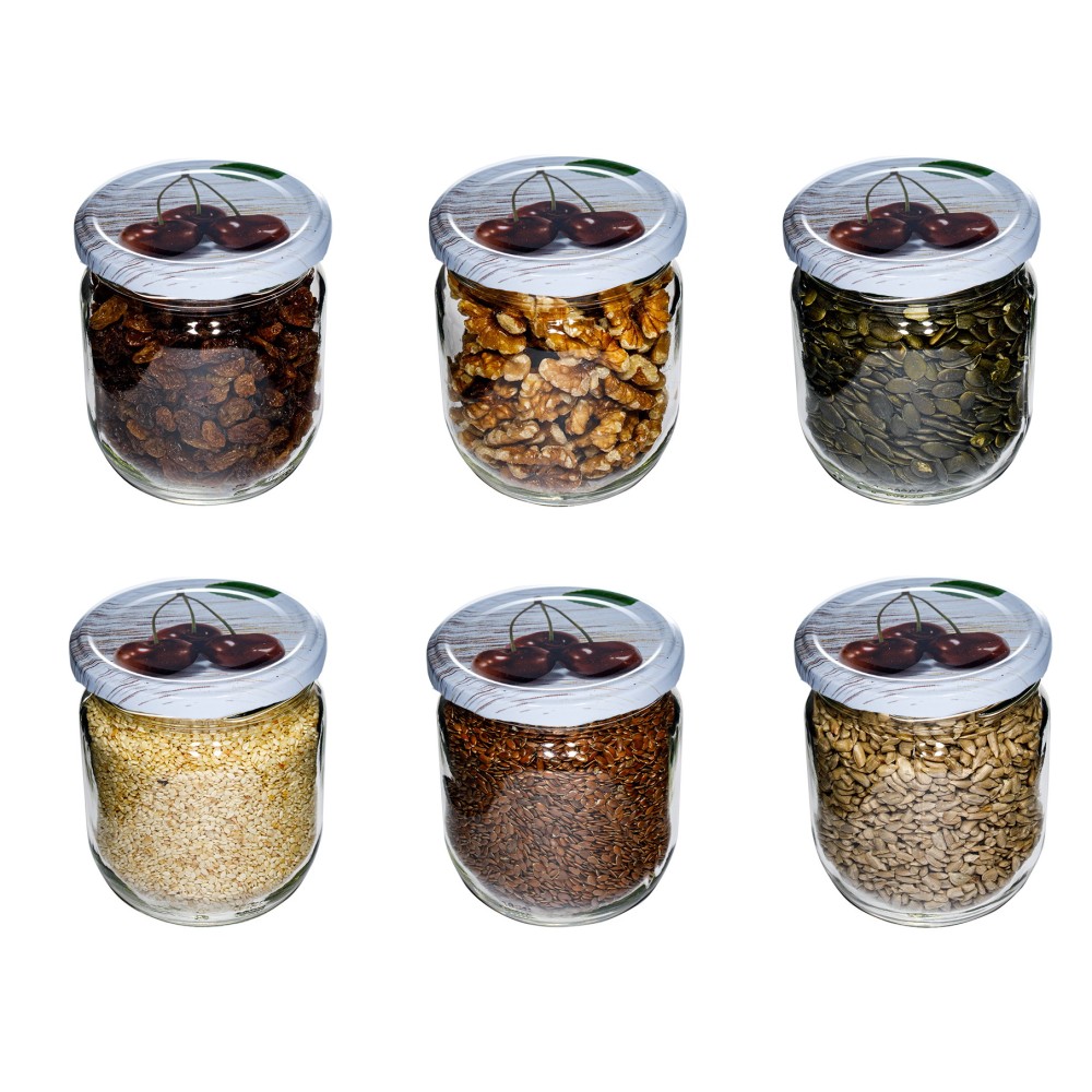Słoik bezbarwny 425 ml · Pokrywka (⌀82) z nadrukiem “czereśnia” · Zgrzewka 6 sztuk