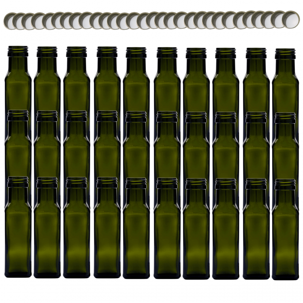 Butelki 100 ml maraski kwadratowe zielone na olej oliwę fi31 30szt NAKRĘTKI