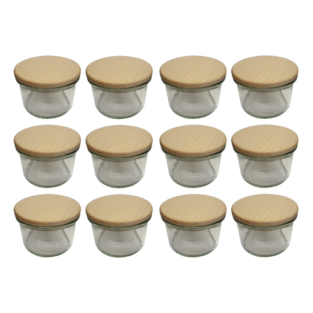 Słoiki Weck 200ml pucharek MOLD żaroodporne drewniane wieka 12szt SOLIDNE