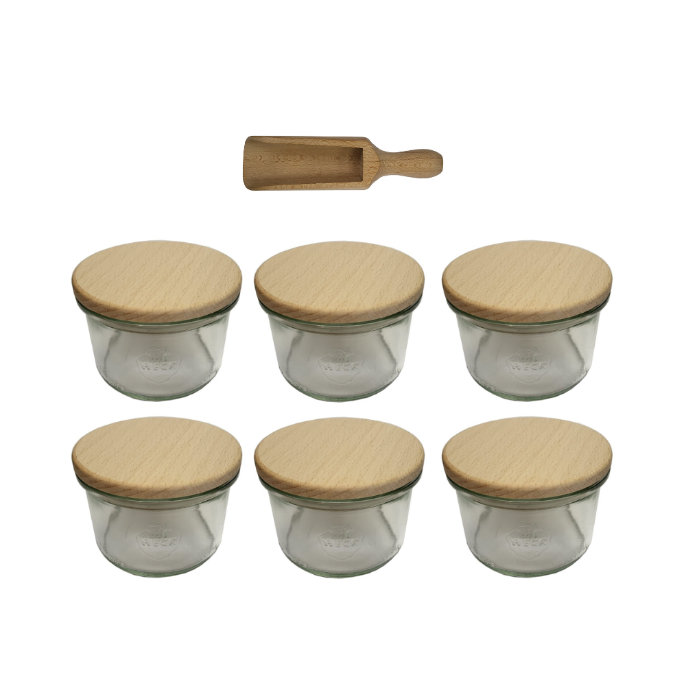 Słoiki Weck 200ml pucharek MOLD żaroodporne drewniane wieka 6szt miarka