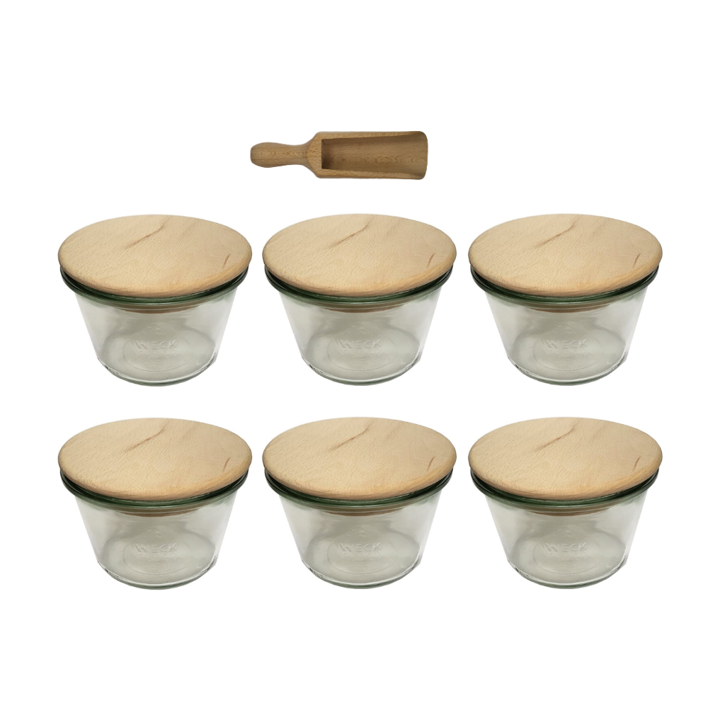 Słoiki Weck 370ml przetwory MOLD żaroodporne drewniane wieka 6szt miarka
