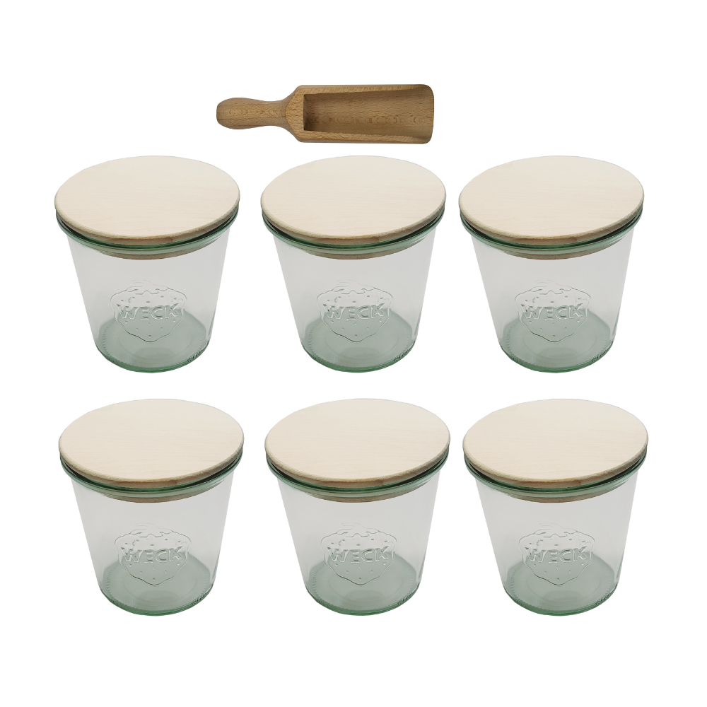 Słoiki Weck 580ml przetwory MOLD żaroodporne drewniane wieka 6szt miarka