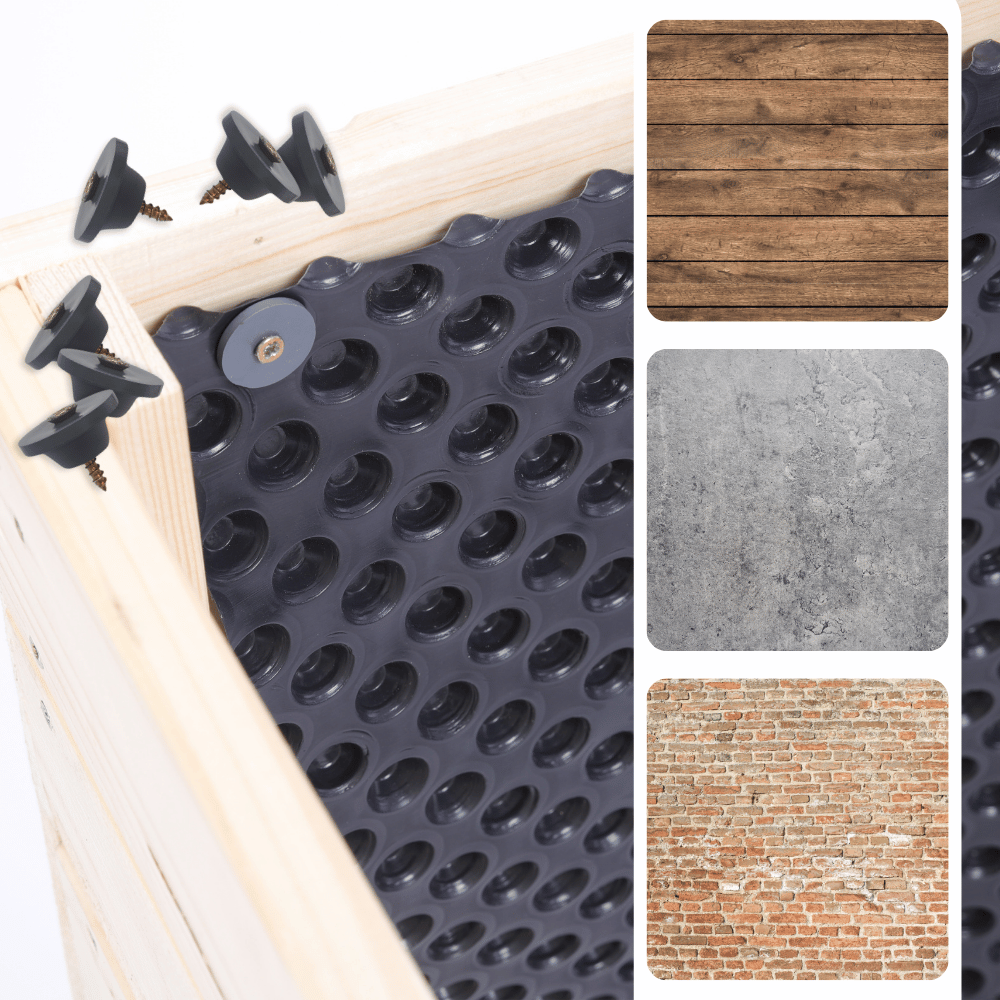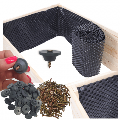 ☝️ Przyciętą folię kubełkową wystarczy umieścić na wewnętrznych ściankach grządki i przymocować zszywkami lub wkrętami z podkładkami. Dzięki elastycznej strukturze folia doskonale dopasowuje się do kształtu grządki.