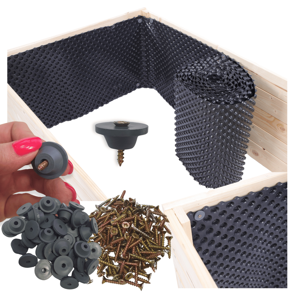 Dzięki specjalnemu kształtowi stabilnie przylegają do powierzchni kubełków, co zapewnia trwałe i estetyczne przymocowanie folii do drewnianej konstrukcji grządki.
