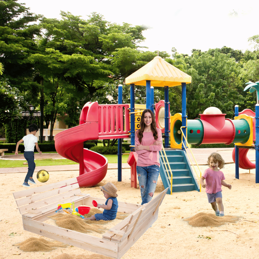 ✅ Dzieci mogą komfortowo usiąść, odpocząć i bezpiecznie korzystać z piaskownicy dzięki solidnej konstrukcji oraz bezpiecznym krawędziom.