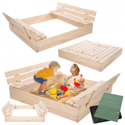 Piaskownica drewniana z ławeczkami, plandeką i agrowłókniną – trwałość, bezpieczeństwo i komfort zabawy!