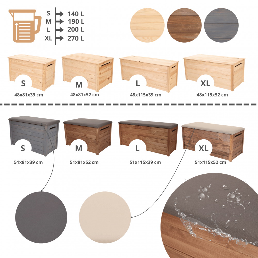 Na innych ofertach zakupisz modele skrzyni w rozmaitych wielkościach i kolorach. Dostępne są wersje nieimpregnowane (naturalne) oraz zaimpregnowane (kolory). Dokonasz zakupu skrzyni z twardym lub miekkim siedziskiem (gąbka tapicerska pokryta wodoodporną tkaniną) w dwóch różnych kolorach.