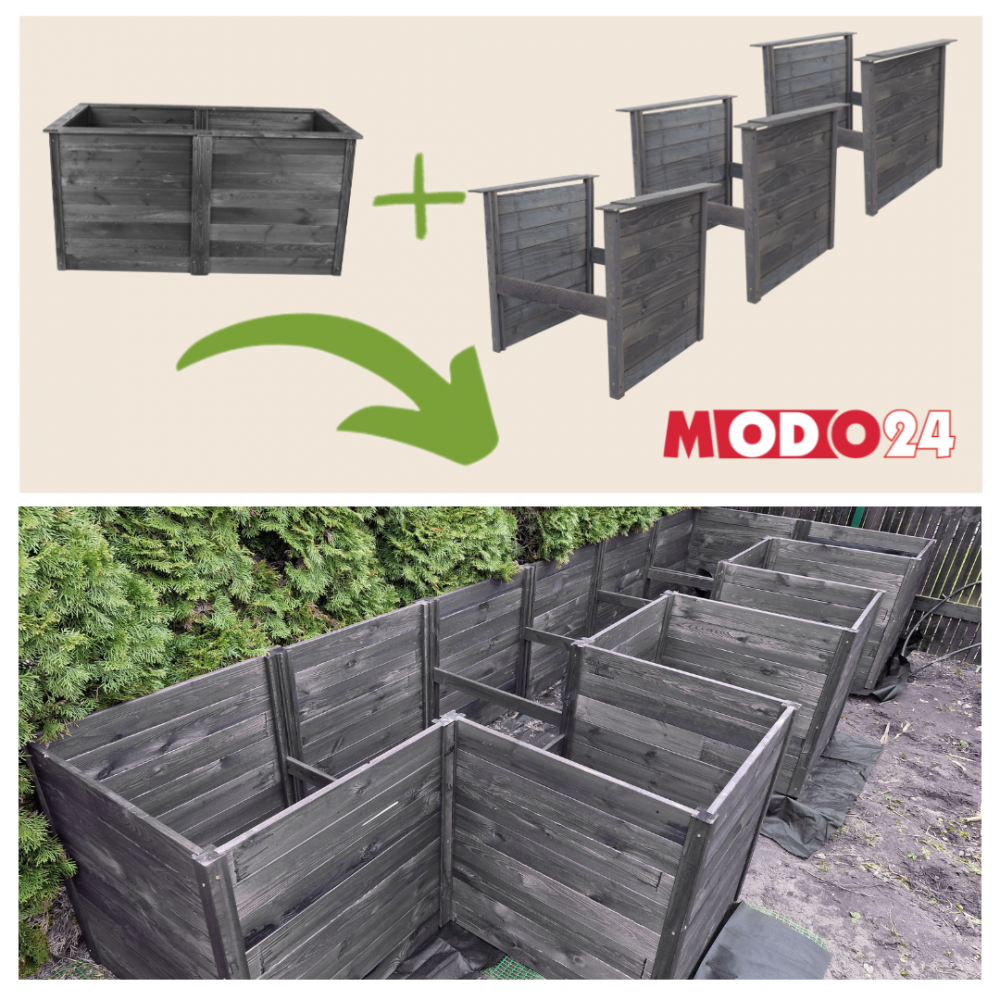Dzięki temu możesz zacząć od jednej skrzyni, a w każdej chwili rozwinąć ją o kolejne części, tworząc większą rabatę w kształcie litery L, U albo wydłużoną w linii prostej.