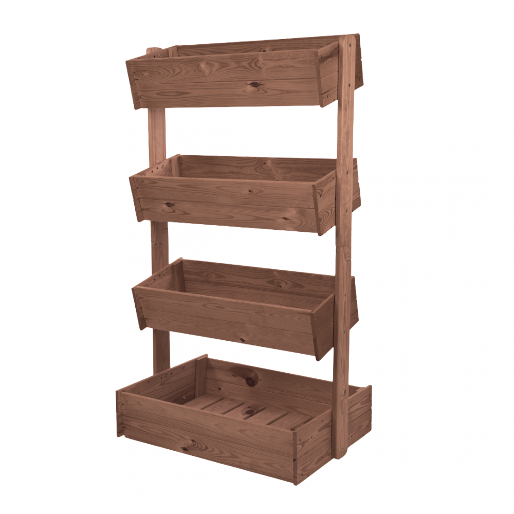 Brązowy kwietnik pionowy o wysokości 146 cm i czterech półkach doskonale łączy estetykę z praktycznością. Impregnacja chroni drewno przed wilgocią, a regulowane półki i boczne elementy zapewniają wygodną ekspozycję kwiatów, ziół czy warzyw.