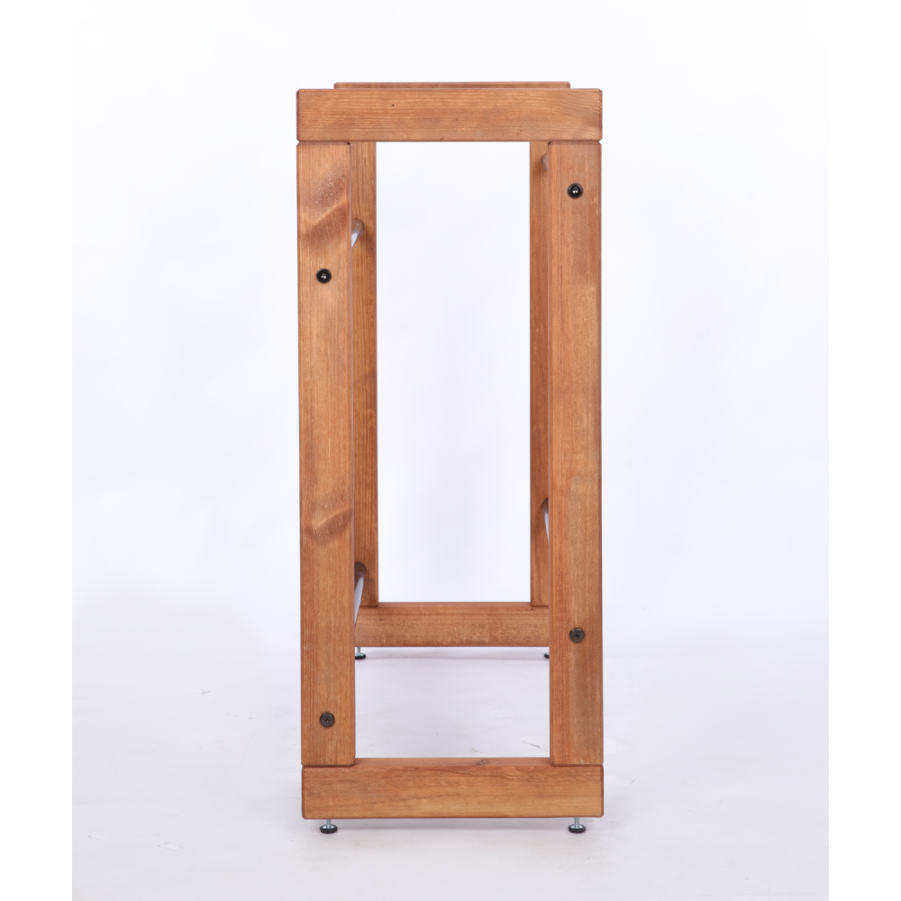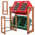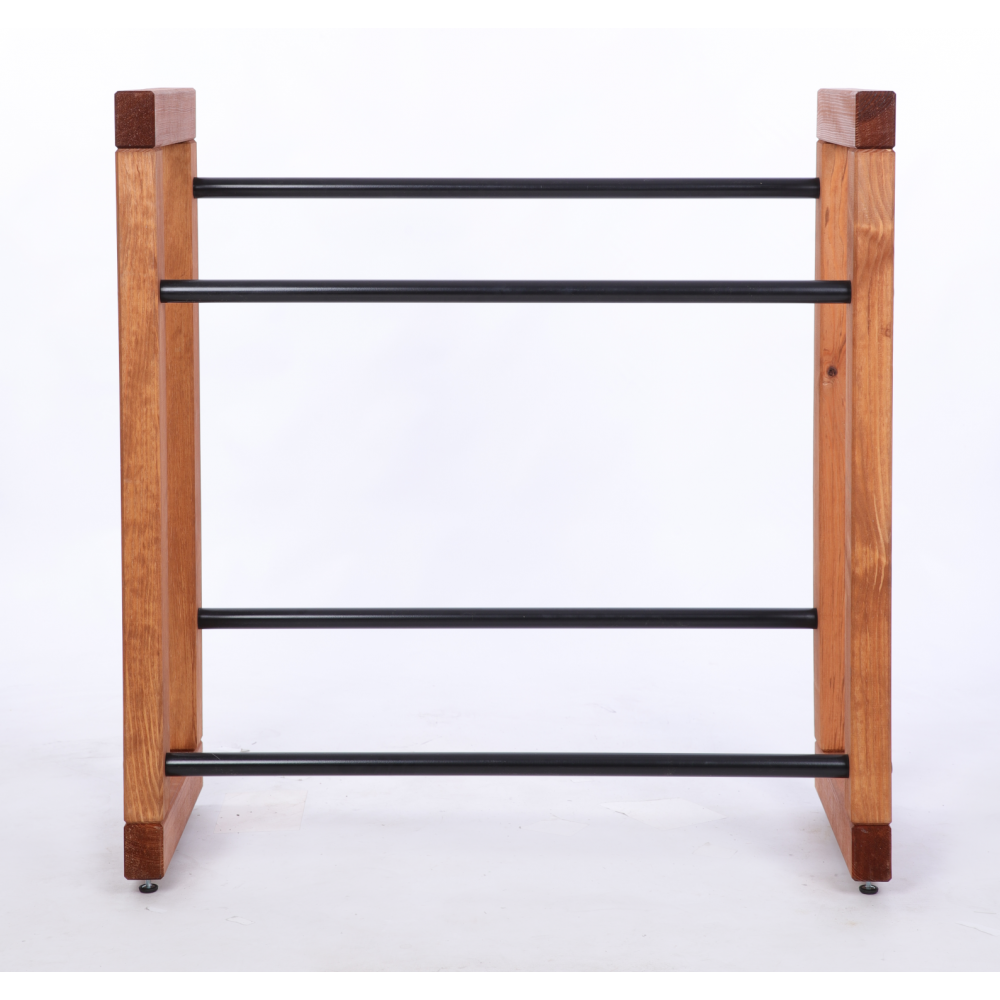Drewniany stojak ekspozycyjny na skrzynki z metalowymi drążkami. Od polskiego producenta. Egzemplarz z bogatej kolekcji stojaków na skrzynki.