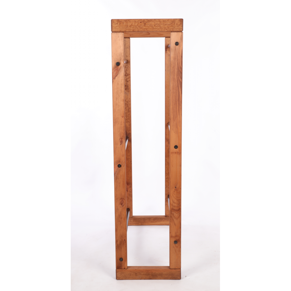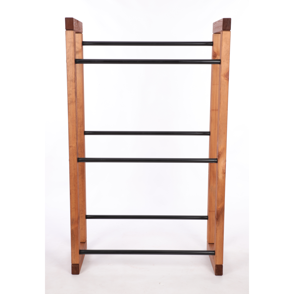 Drewniany stojak ekspozycyjny na skrzynki z metalowymi drążkami. Od polskiego producenta. Egzemplarz z bogatej kolekcji stojaków na skrzynki.
