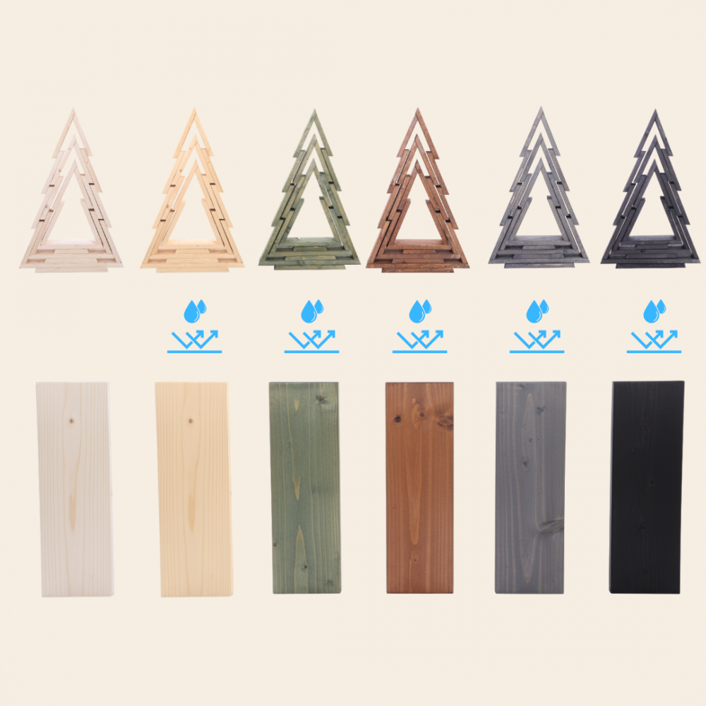 ➡️ Ta choinka jest częścią kolekcji dostępnej w kilku wykończeniach – od naturalnego, surowego drewna po nowoczesne, impregnowane kolory, dzięki czemu łatwo dopasujesz dekorację do stylu swojego wnętrza.