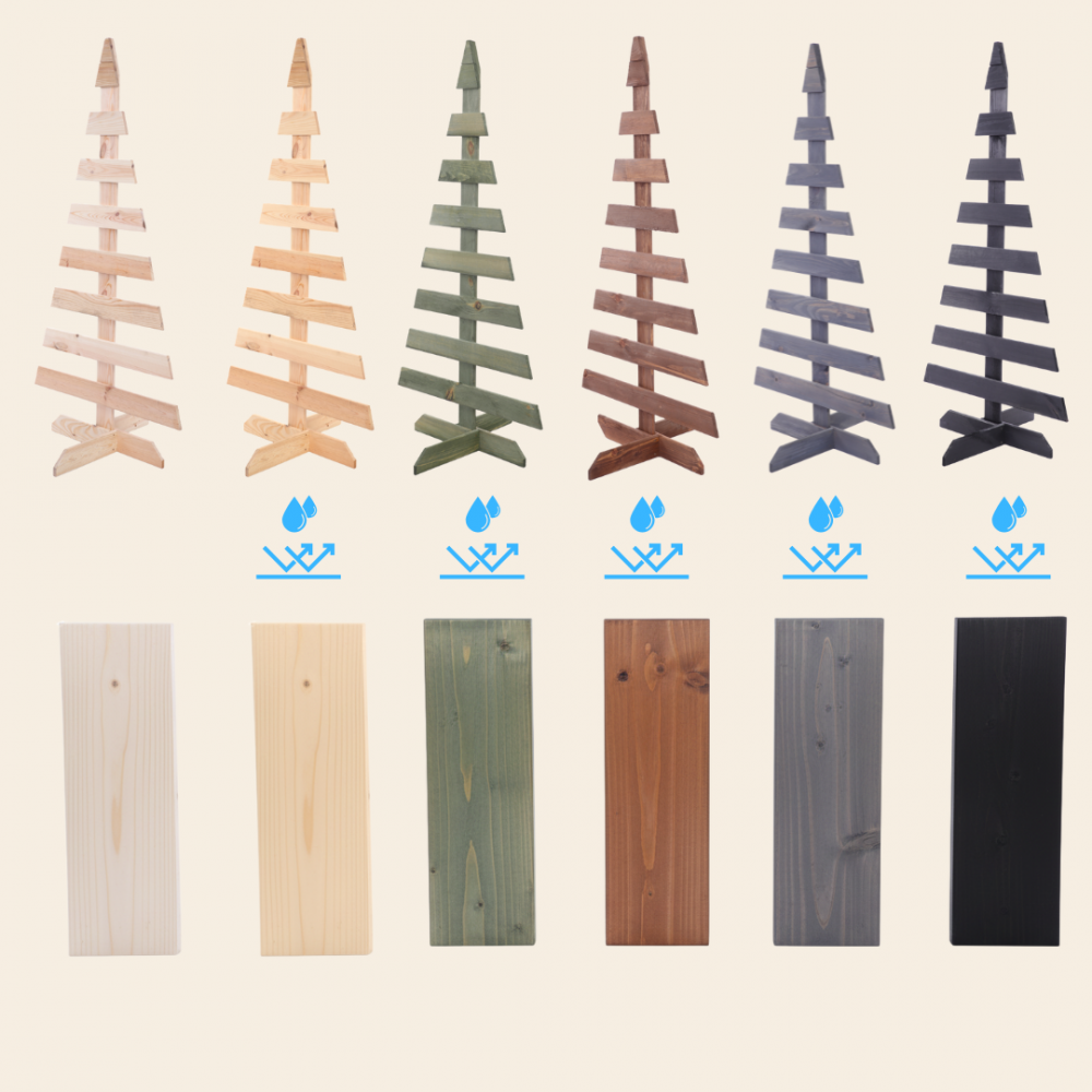 ➡️ Choinki dostępne są w kilku wykończeniach, dzięki czemu stworzysz dokładnie taki klimat, jakiego potrzebujesz – od naturalnego, surowego drewna po nowoczesne, impregnowane kolory.