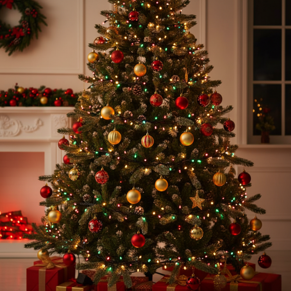 ⭐ Odpowiednio rozmieszczone lampki świąteczne podkreślają detale choinki i dekoracji, wypełniając przestrzeń miękkim blaskiem.